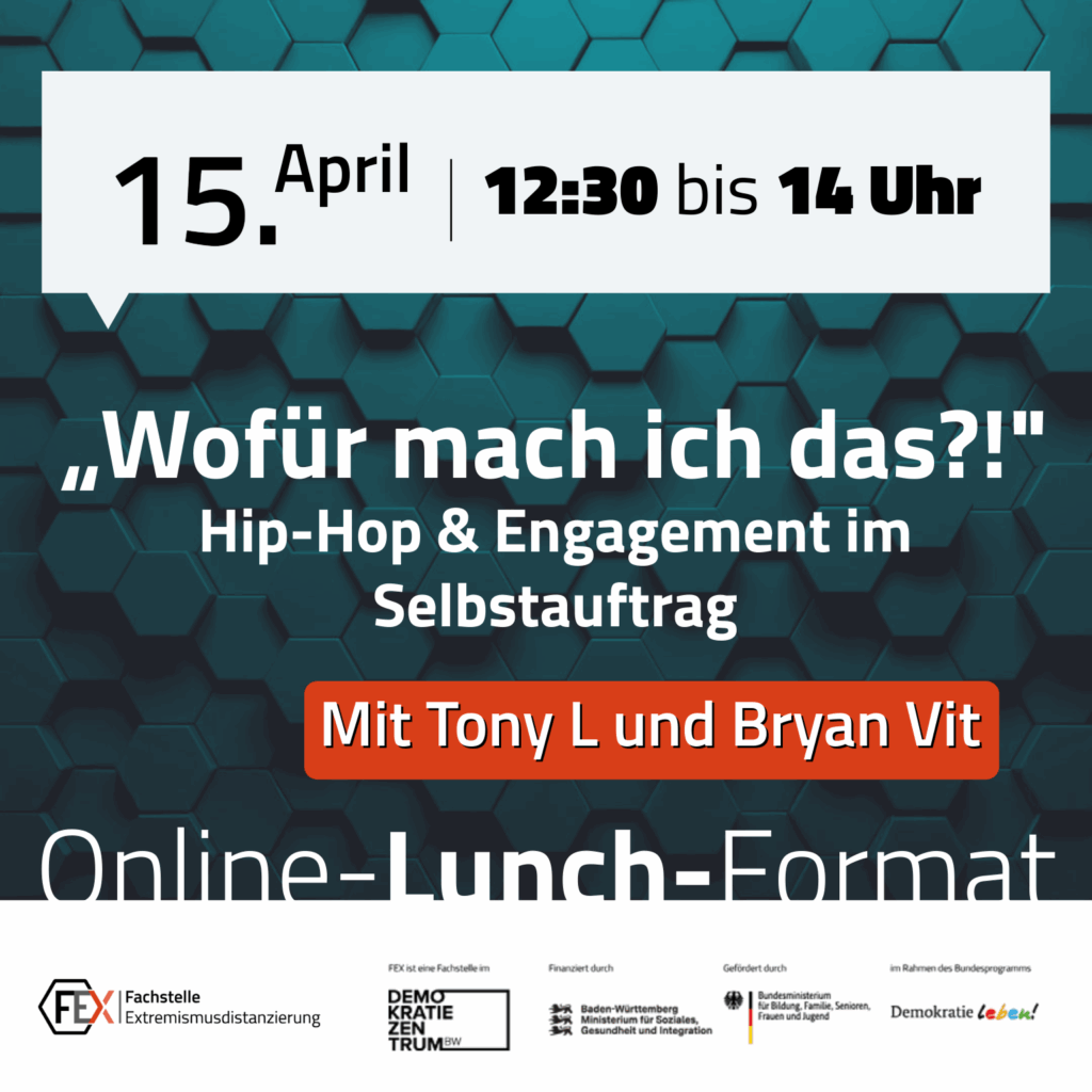 Die Fachstelle Extremismusdistanzierung (FEX) organisiert diese Veranstaltungsreihe, um Fachkräfte und interessierte Bürger:innen zu sensibilisieren und Handlungswissen quer durch verschiedene Professionen zu erweitern.