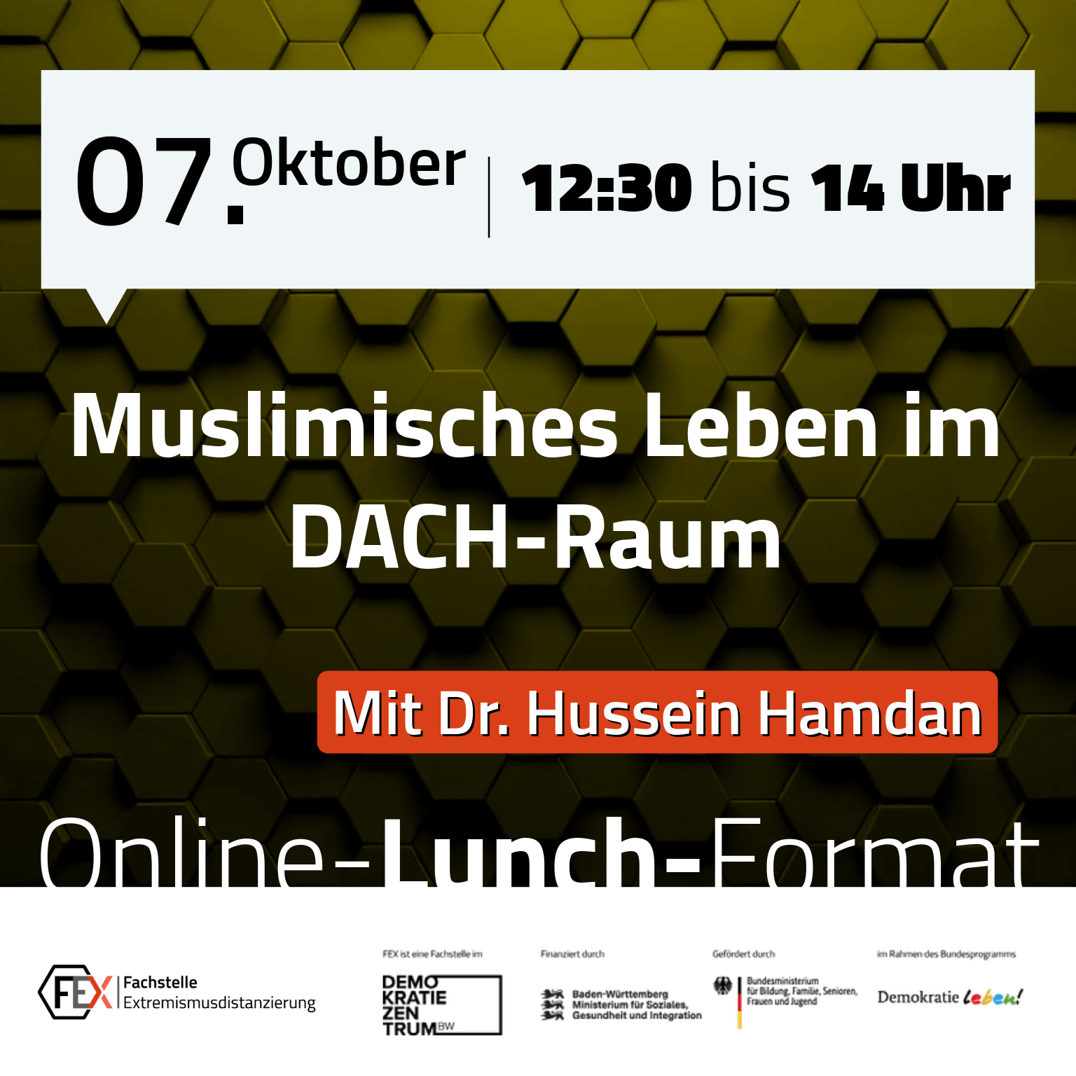 ZoomMuslimisches Leben im DACH-Raum Erkenntnisse aus dem Projekt „Brückenbauen im DACH-Raum“ Oktober 7 @ 12:30 - 14:00 Veranstaltungsbeschreibung: Wie gestaltet sich muslimisches Leben im deutschsprachigen Raum – und welche Gemeinsamkeiten und Unterschiede zeigen sich zwischen Deutschland, Österreich und der Schweiz? In diesem Online-Lunch stellt Dr. Hussein Hamdan zentrale Erkenntnisse aus dem transnationalen Projekt „Brückenbauen im […]