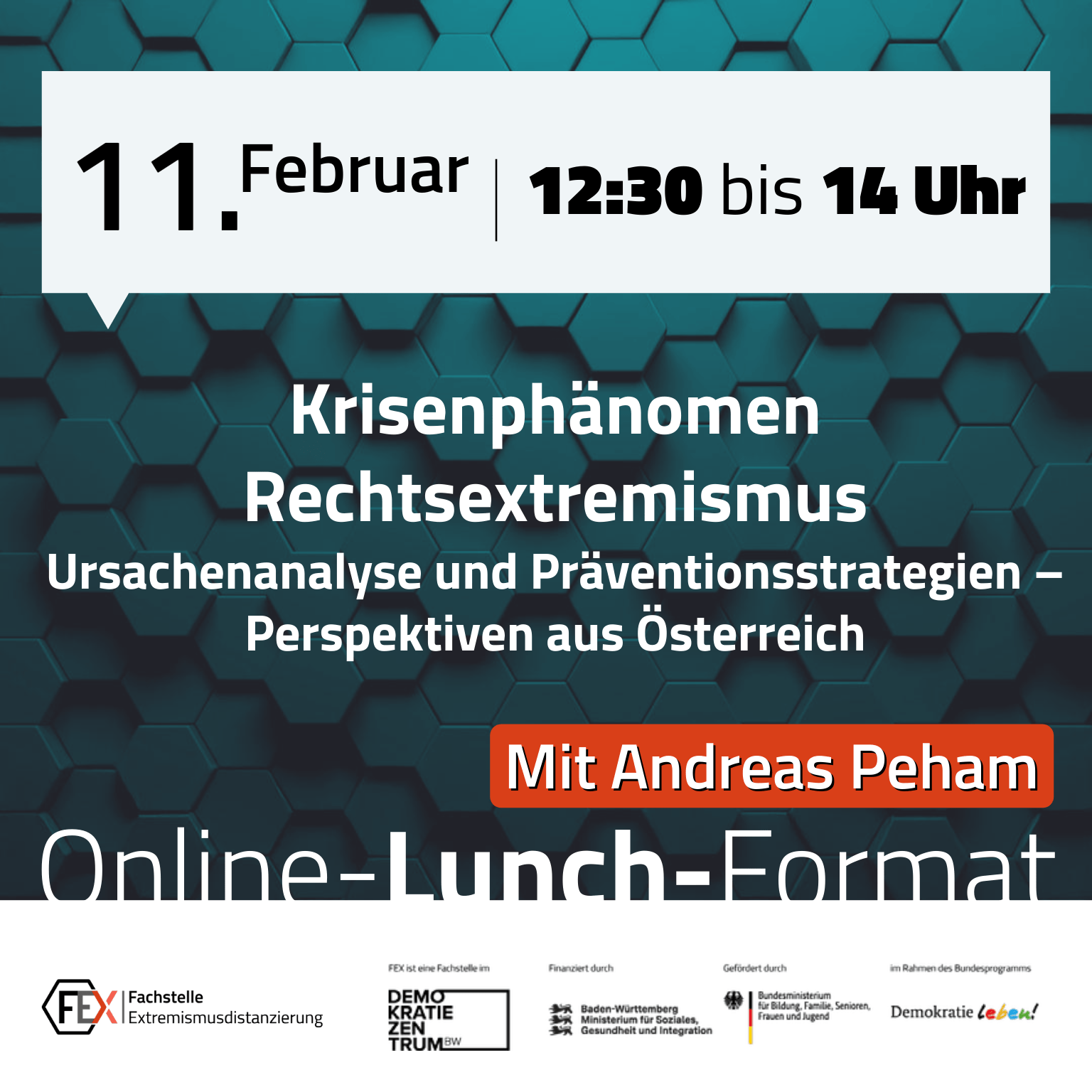 ZoomKrisenphänomen Rechtsextremismus Ursachenanalyse und Präventionsstrategien – Perspektiven aus Österreich Februar 11 @ 12:30 - 14:00 Veranstaltungsbeschreibung: Was bringt Menschen dazu, sich extrem rechten Ideologien zuzuwenden – und was lässt andere […]