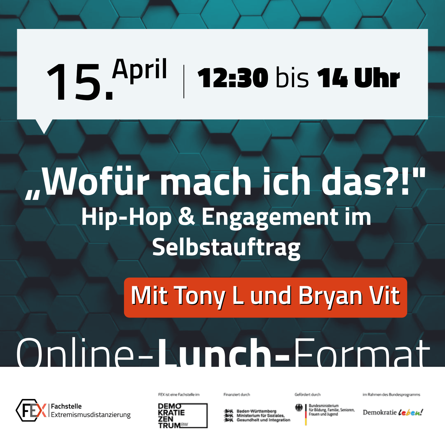 Zoom„Wofür mach ich das?!“ Hip-Hop & Engagement im Selbstauftrag April 15 @ 12:30 - 14:00 Veranstaltungsbeschreibung: "Wofür mach ich das?!", fragt Rapper und Philosoph Lakmann auf dem gleichnamigen Song von 2013. Diese Frage greifen Toni „Toni-L“ Landomini und Bryan Vit auf – und setzen sie in den Kontext ihrer langjährigen Bildungsarbeit an der Schnittstelle von […]