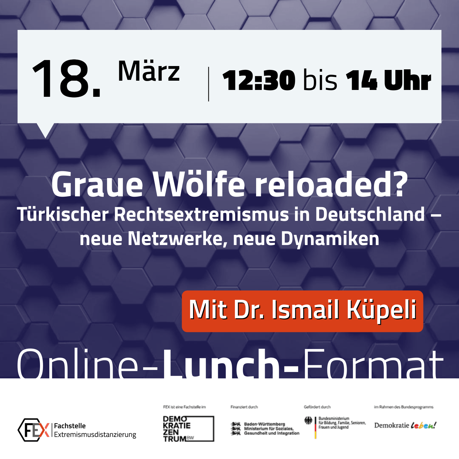 ZoomGraue Wölfe reloaded? Türkischer Rechtsextremismus in Deutschland – neue Netzwerke, neue Dynamiken März 18 @ 12:30 - 14:00 Veranstaltungsbeschreibung: Mit rund 12.000 Anhänger:innen gilt der türkische Rechtsextremismus – oft unter dem Begriff „Graue Wölfe“ oder als Ülkücü-Bewegung bekannt – als die zweitgrößte extrem rechte Bewegung in Deutschland. Ihre Ideologie ist durchzogen von autoritären, nationalistischen, antisemitischen, […]